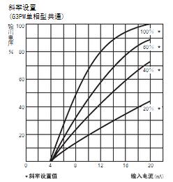 ●相位控制 ●斜率设置 如右图所示,通过内部或外部电位器调整输出变化量的功能。 如果是电炉,在使用相对于炉面积容量较大的加热器时会导致过冲。 可以通过斜率设置电位器抑制过冲。 例如,如果在5kW的加热器中设定60%的斜率,将作为3kW max.使用。1 ●软启动